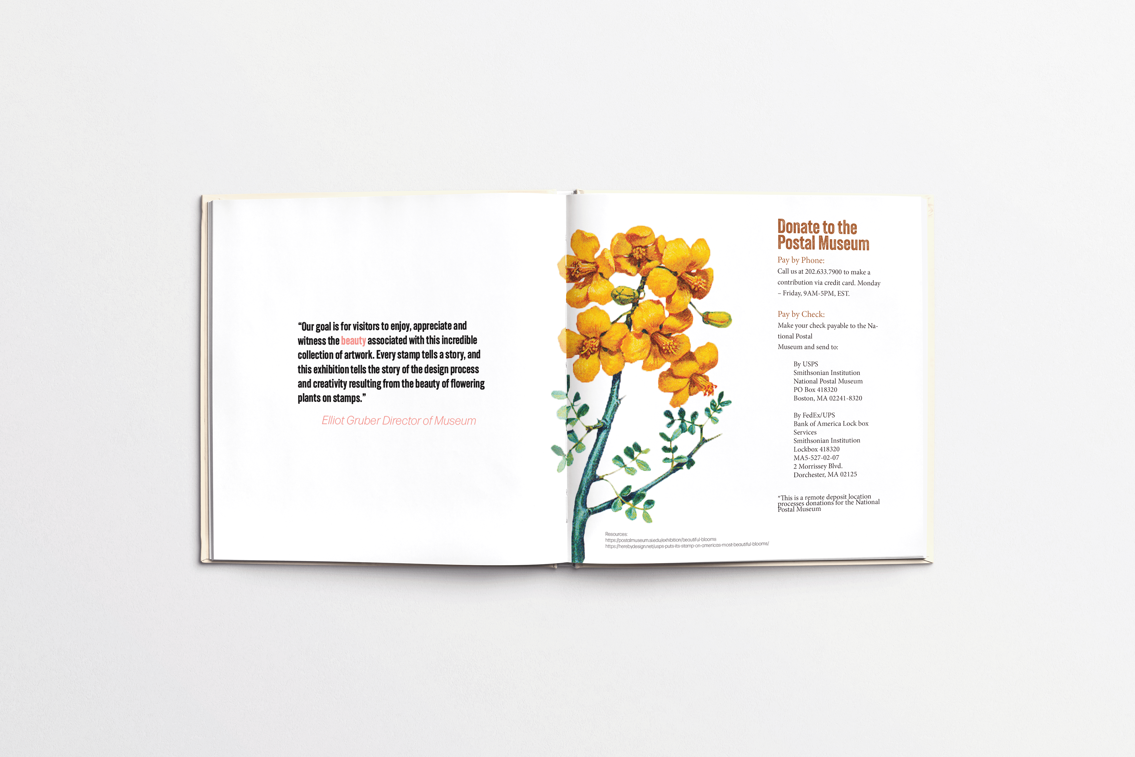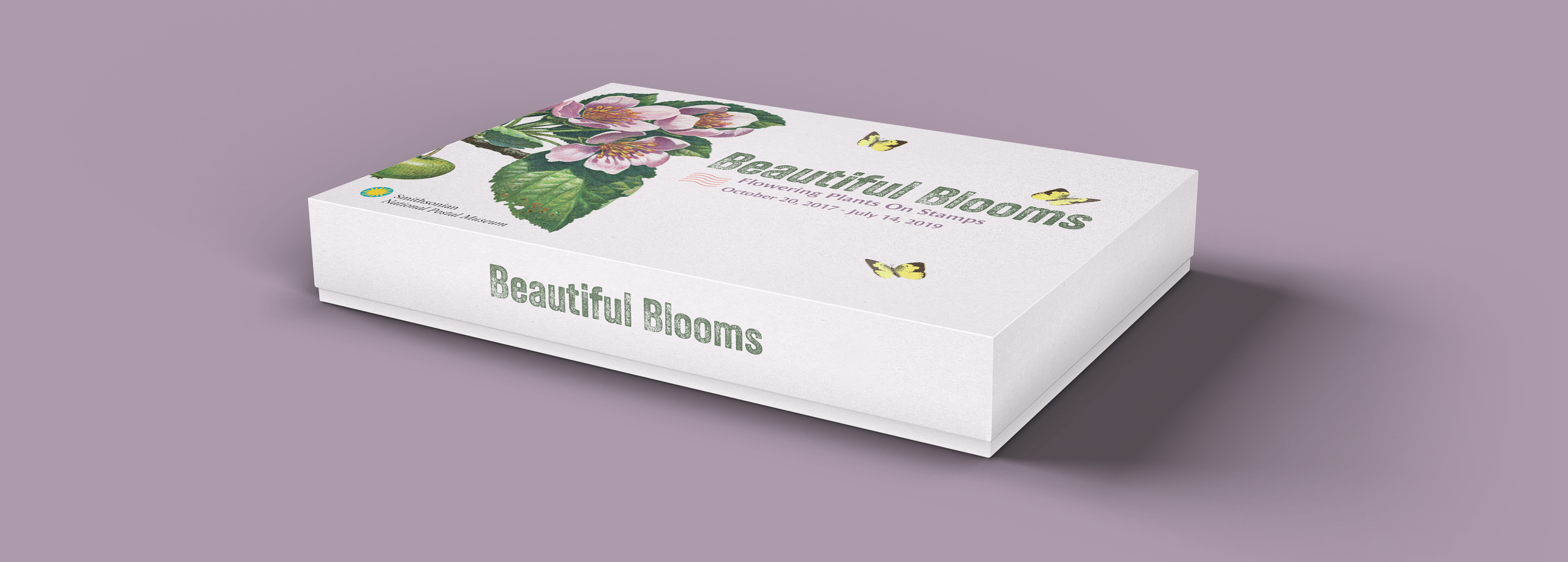 Exhibition package for the Beautiful Blooms exhibit at the Smithsonian Postal Museum. Guidebook, packaging and "postcards" | 2023