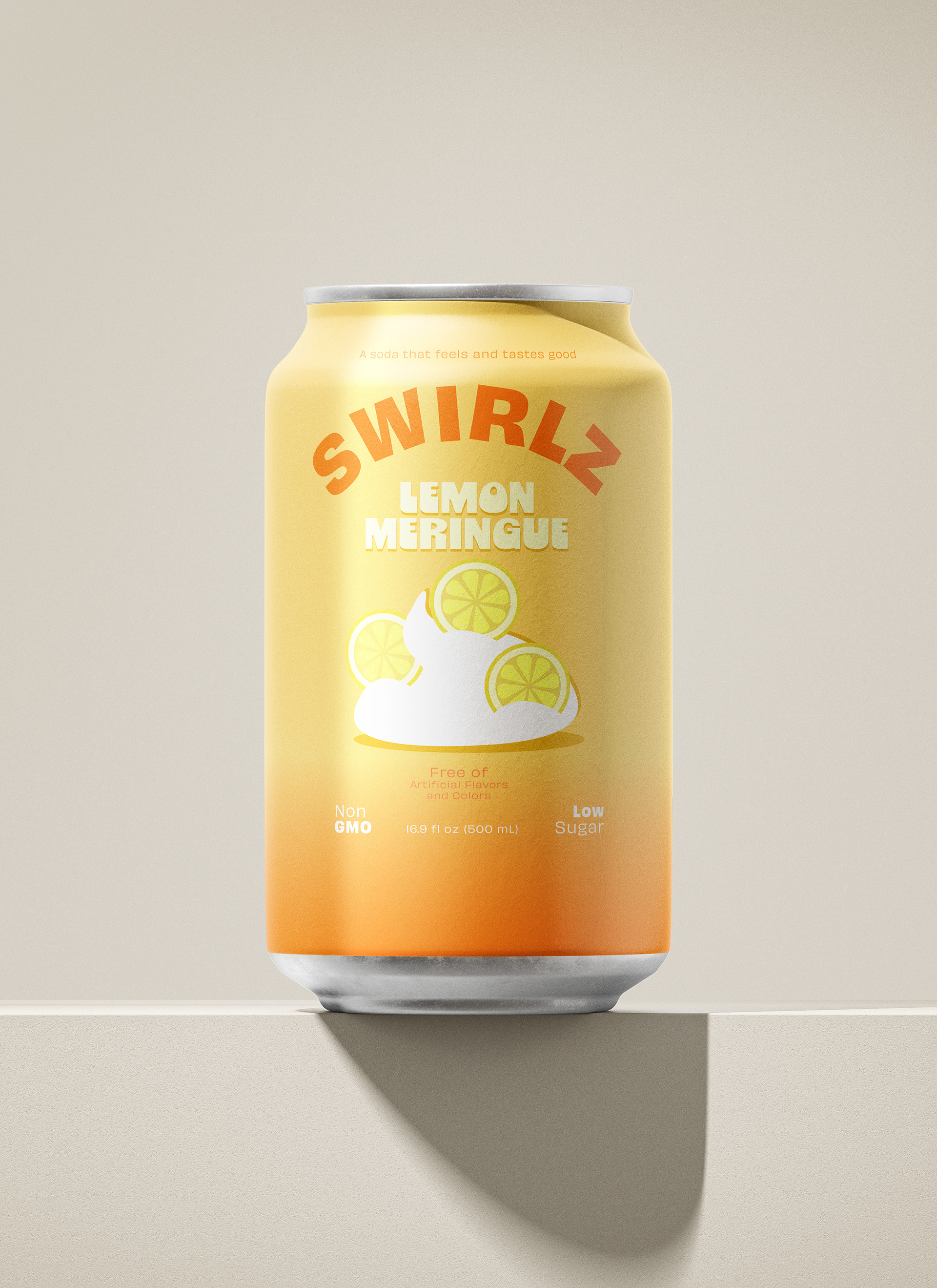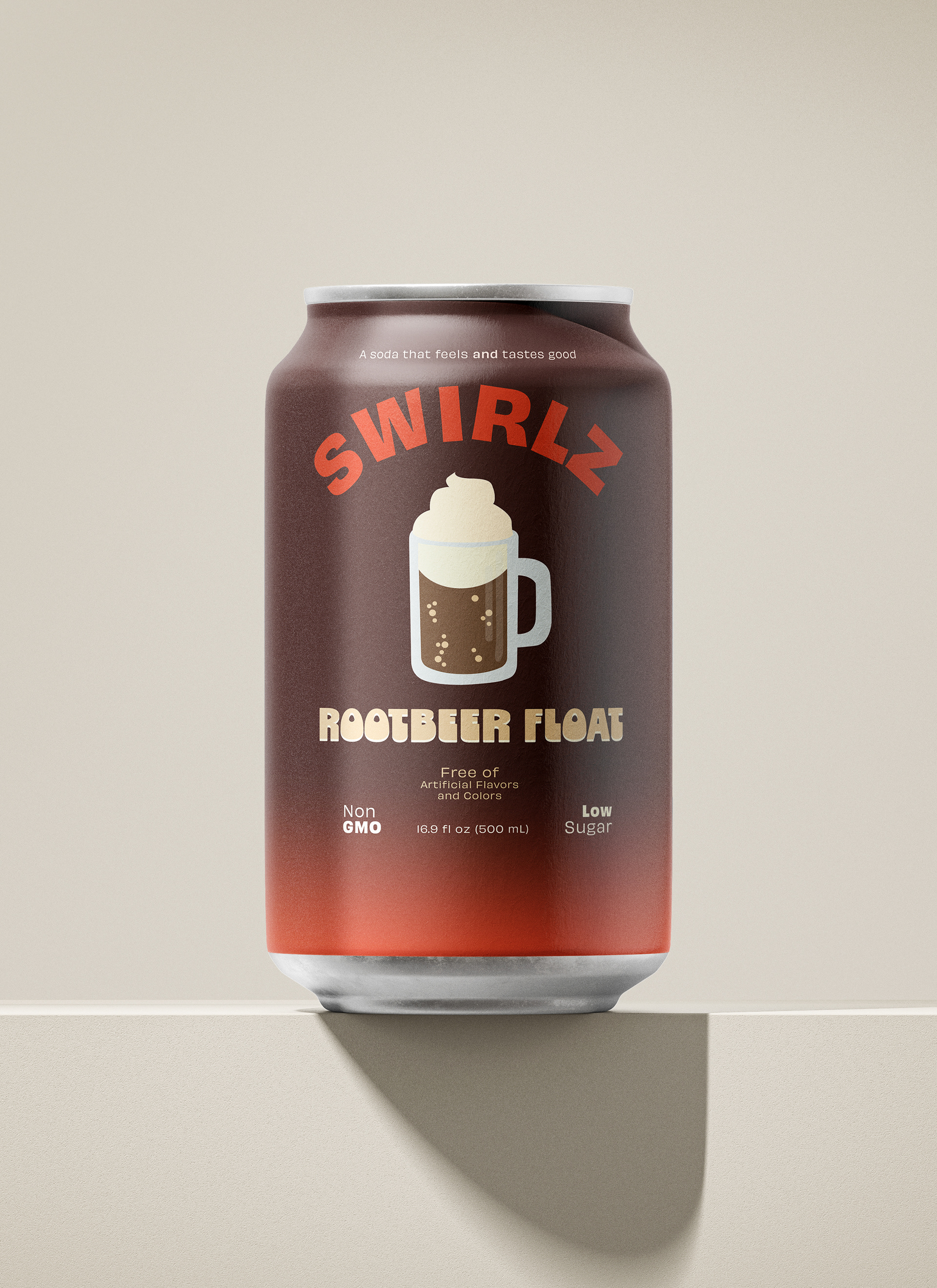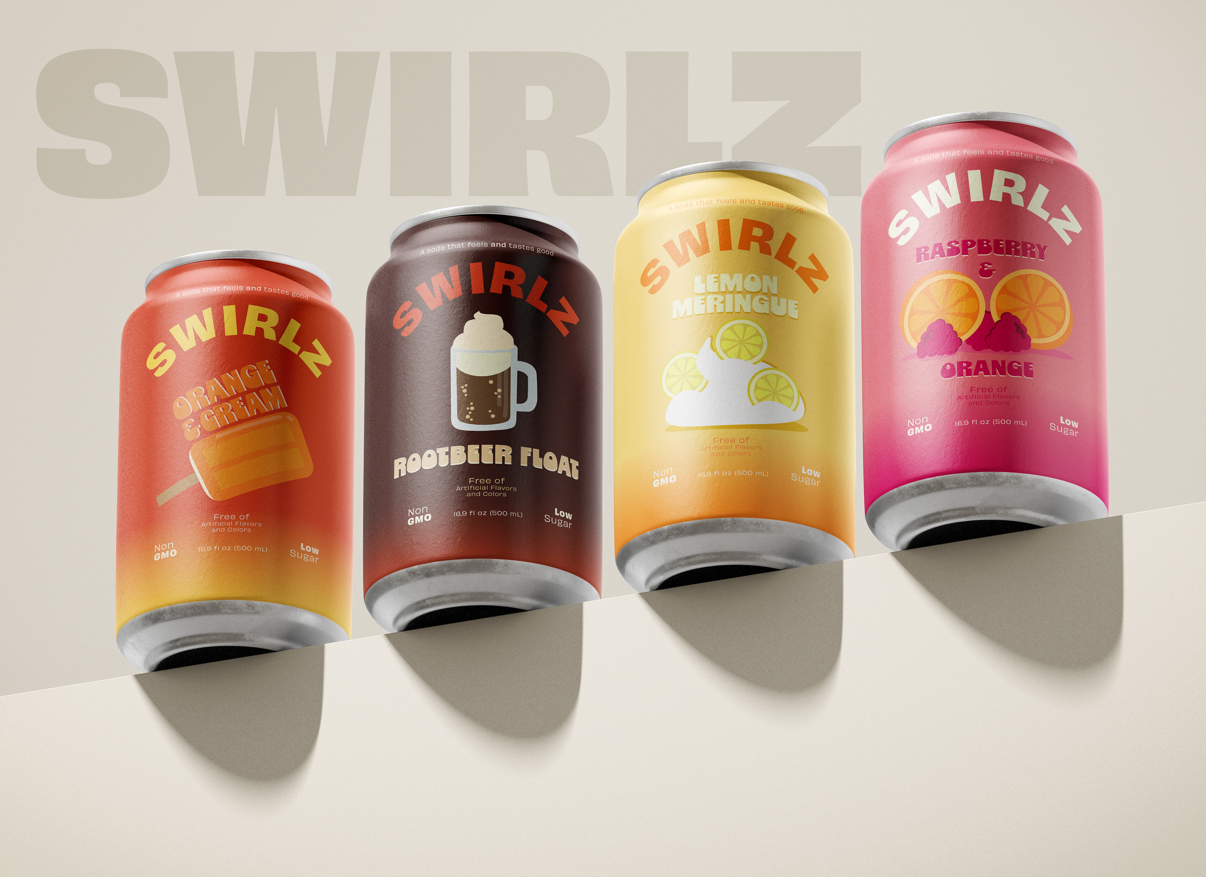 Four distinct can designs of a healthy, probiotic soda that fall under the same branding principles | 2024
